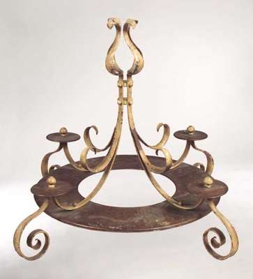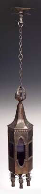 A set of eight Arts and Crafts copper and wrought iron ceiling lights,