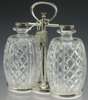 with two swollen cylindrical cut glass decanters contained within shaped frame with loop handle, stamped mark 1500 (with key)