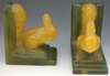 each moulded as seated squirrels in green and yellow glass, moulded marks 'A Walter, Nancy' and 'Berge Sc' (chips)