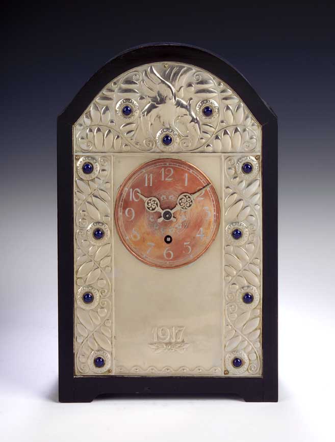 in the style of the Weiner Werkstatte, the single train movement with circular copper dial with silvered numerals and pierced hands, within silvered border repoussé decorated with flowering foliage set with blue cabochons within an ebonised case, dated 1917