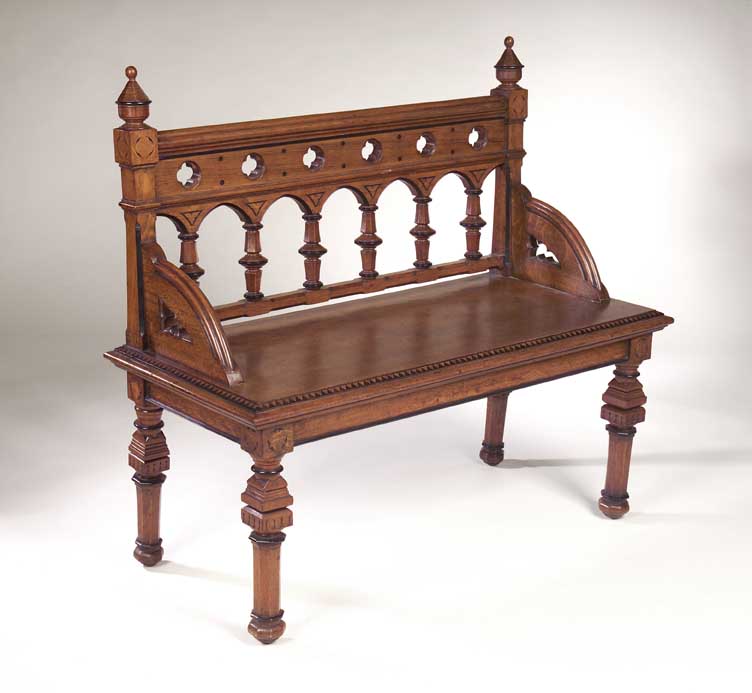 in the manner of Charles Bevan, the arcaded back pierced with quatrefoils and supported by curved brackets, the solid seat with moulded edge and serrated inlay above square section faceted legs