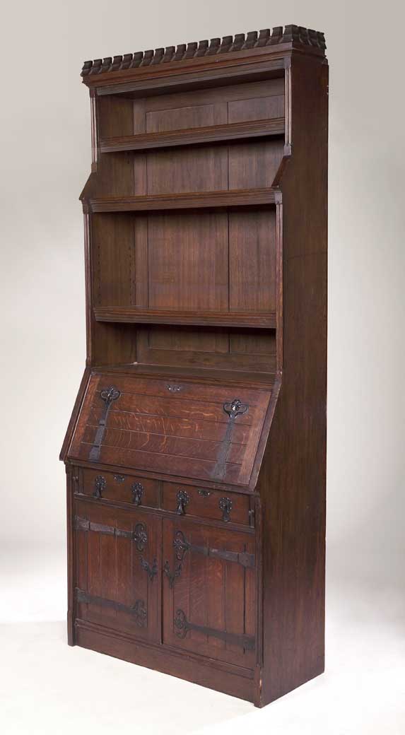 in the manner of Richard Norman Shaw, the castellated cornice above three adjustable shelves flanked by pilasters, the sloping fall enclosing a fitted interior, above two drawers and two panelled doors with decorative ironwork, the whole raised on a plinth base