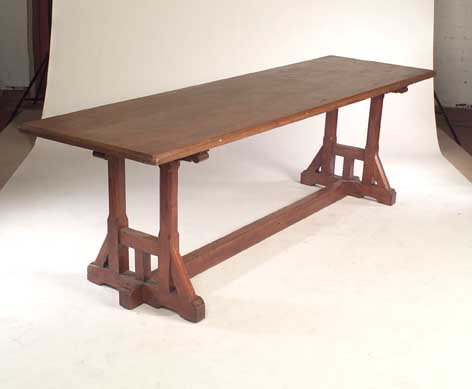 the rectangular top with canted edge above twin canted supports on trestle ends linked by a stretcher and support by angled brackets
