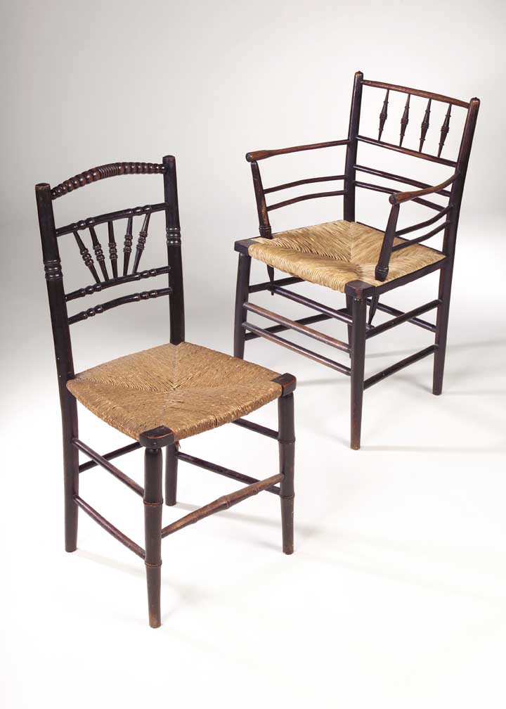 the curved back with spindle gallery and horizontal rails enclosed by open arms and rush seat, raised on turned legs and linked by stretchers; a Morris & Co style ebonised side chair (2)