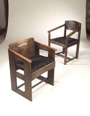 the sloping pierced back with open arms above drop-in horsehair seat on cut out side supports linked by stretchers; also a stained oak open armchair after Charles Rennie Mackintosh, the pierced back above sloping open arms and drop-in horsehair set raised on square legs linked by stretchers (2)