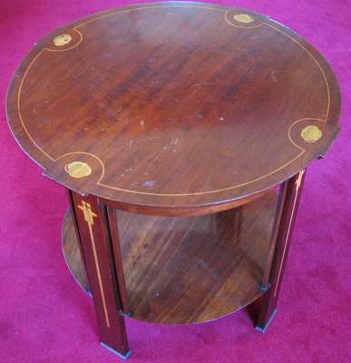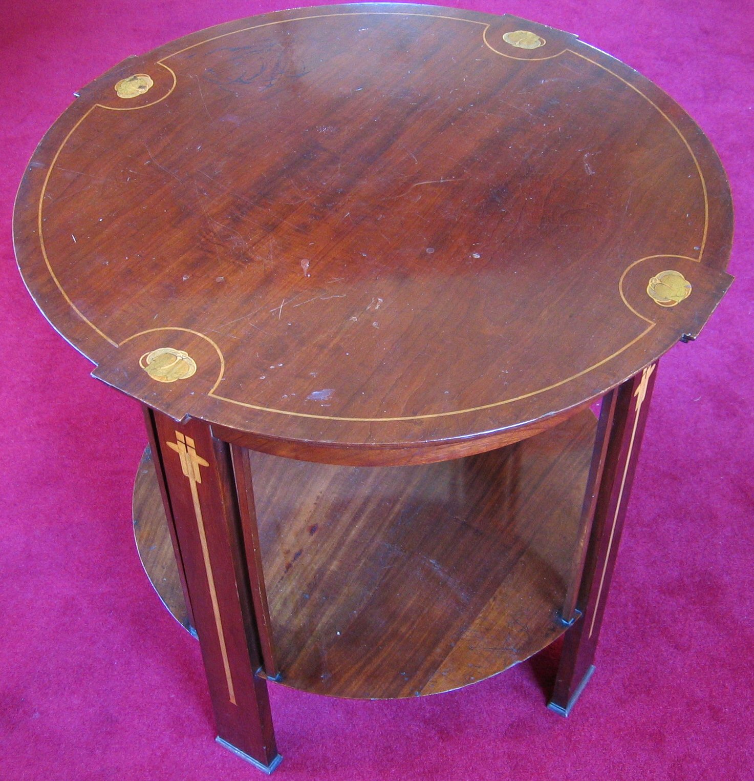 in the manner of G.M. Ellwood for J.S. Henry, the circular top with boxwood line and four inlaid stylised leaf clusters, above four rectangular supports, inlaid with stylised plant forms and linked by a lower tier