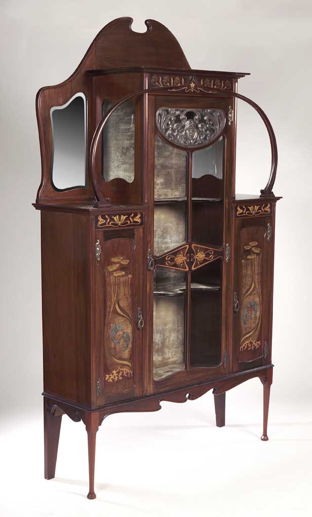the shaped back inset with bevelled mirrored plates enclosing a single astragal glazed door, the upper panel overlaid with pierced silvered plate, the bars inlaid with whiplash flowering foliage, supported by curved brackets and enclosed by panelled doors inlaid with fish swimming through water lilies, the whole raised on faceted tapering legs, locks stamped Salmon Brothers, London