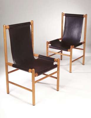 comprising a table, the circular top raised on six deeply inset turned legs, 178cm diameter, 72cm high; and eight matching dining chairs, including two carvers, each with brown buffalo hide slung seats on turned supports, with suede cushions, stamped marked to legs