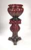 the lobed ovoid jardiniere raised on a stand moulded with three griffin caryatids on a concave triform plinth, the whole covered in streaky green and sang de boeuf glazes, restored base (2)