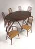 comprising a gateleg table, the crossbanded oval top above strut supports, 196cm long, 73cm high, 130cm deep; and a set of six matching chairs, including two carvers, each with tapering slat filled backs above upholstered seats on turned legs linked by stretchers (7)