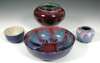 comprising a circular bowl, glazed in streaky turquoise and red, printed and incised mark, dated 1905, 20cm across; a squat ovoid vase, glazed in sang de boeuf, impressed and painted marks, dated 1906, initialled 'H.A.' 11cm high; a small shouldered vase, glazed in blue and red, incised and painted marks, dated 1906, initialled 'H.A.', 6cm high; and a blue-glazed circular bowl, incised mark, 9.5cm diameter (4)