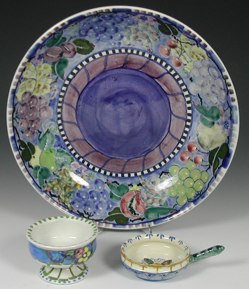 painted with a band of autumn fruits, painted marks, 29cm across; also a Mak' Merry ramekin, painted marks and dated 1925, 12.5cm, and a Mak Merry footed salt, painted mark, 8cm diameter (3)