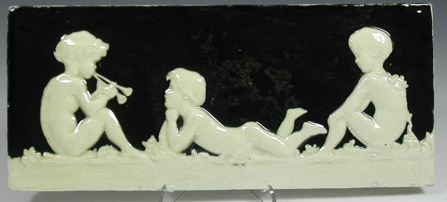 moulded with a frieze of children listening to music, glazed white on a black ground, incised marks with initials 'E.W.'