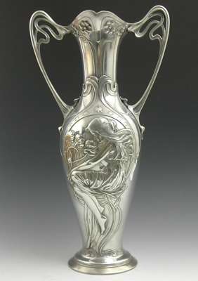 of baluster form, cast with whiplash foliage and panel depicting a maiden smelling flowers, stamped makers marks