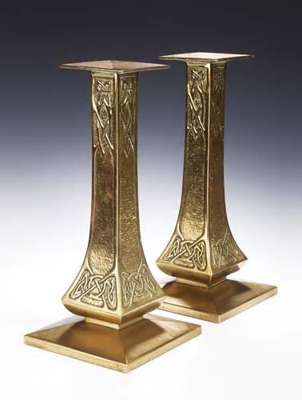 of square section tapered form, with liners, in the style of Alexander Ritchie, Iona, each of footed tapering form decorated with repousse panels of Celtic designs (2)