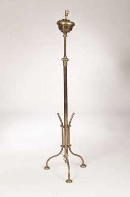 in the manner of W.A.S. Benson, converted to electricity, the ovoid reservoir above adjustable column with scrolling and wrythen brackets raised on a tripod base, 150cm high; also another similar brass standard lamp (2)