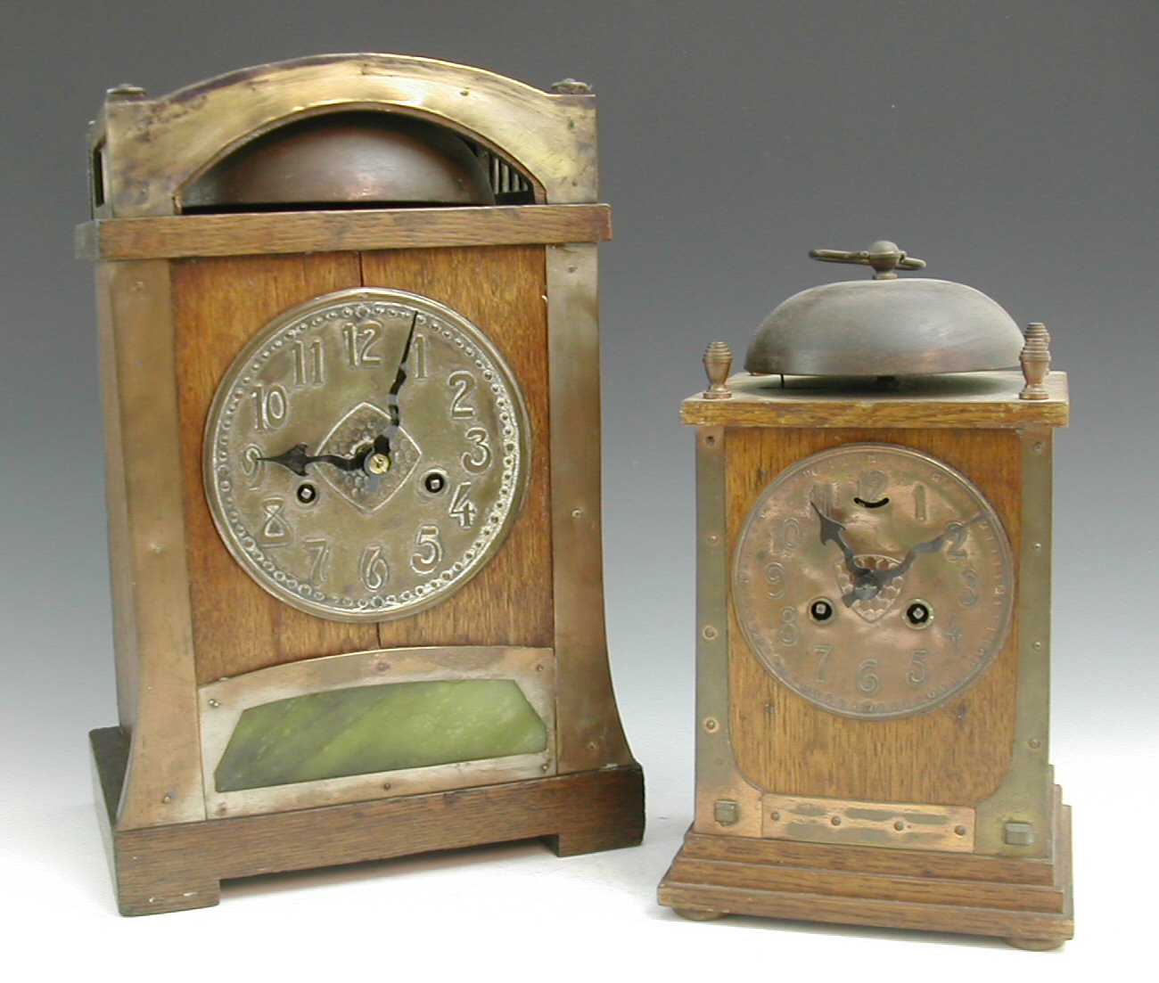 by the Hamburg America Clock Company, the twin train movement within brass bound case with 'Vaseline' gfass panel and exposed steel bell, 37cm high; and a small oak and copper mounted 8-day clock, with exposed steel bell, 32cm high (2)