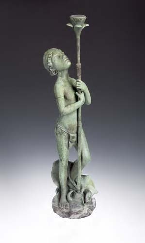 cast as a nubian youth holding aloft a water lily flower stem and raised on a base cast with water lily leaves