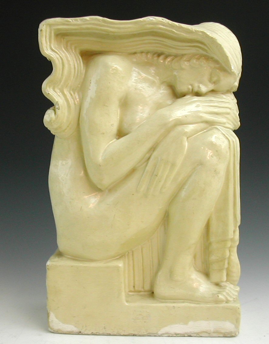 in the manner of Eric Gill, depicting a crouching girl, with long flowing hair