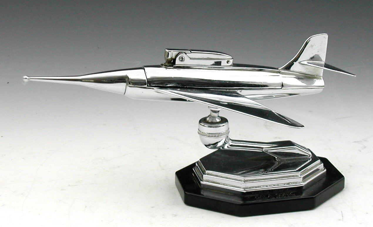 cast in the form of a jet plane with removable lighter part on canted base, moulded marks