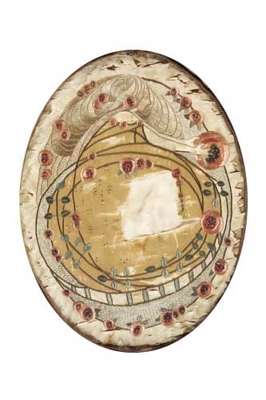 worked in the manner of Margaret or Frances Macdonald, with a maiden, holding a stylised rose within a flowerhead and foliate border, oval frame