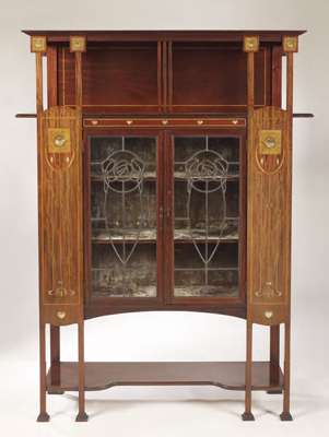 the projecting cornice above open shelf and frieze of mother of pearl hearts, over twin leadeed and glazed doors depicting stylised roses, flanked by inlaid panels of flowering thistles, the whole raised on square supports linked by a lower tier