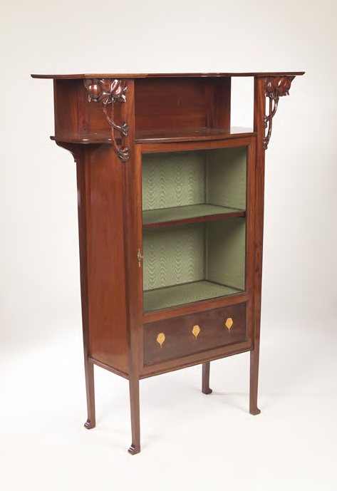 of Art Nouveau style, the curved superstructure supported by brackets carved with fruiting branches, the single glazed door enclosing shelves above an inlaid panel on square legs with pad feet