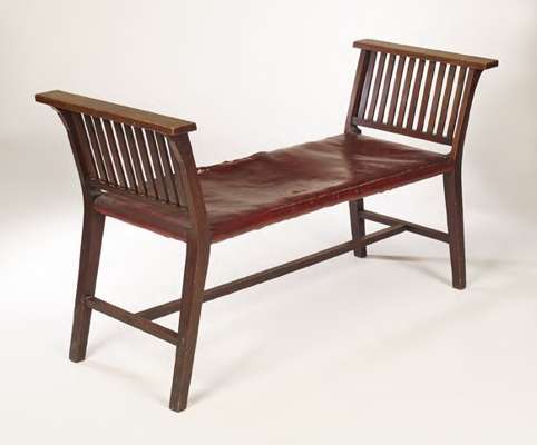 in the manner of Gustav Stickley, with slatted side arms and stuffover seat raised on splayed square tapering legs linked by stretchers