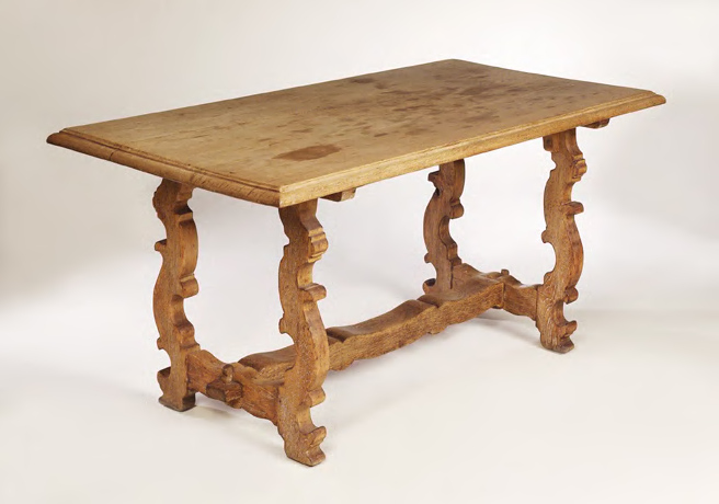 the rectangular moulded top above scrolling supports linked by a shaped corresponding stretcher
