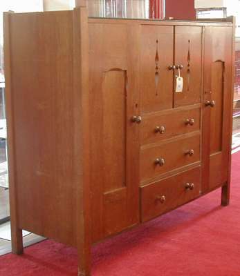 the rectangular top with three quarter gallery, above two central carved doors and three drawers, flanked by panelled doors on square legs