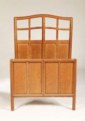 Note: Bears label inscribed; 'This piece, a bed in English oak, no. 179, was designed and made throughout in the Russell Workshops in Oct/Nov 1925. Designer; S. Gordon Russell, Foreman; E. Turner; Cabinet Maker; S.G. Gilbert.'
