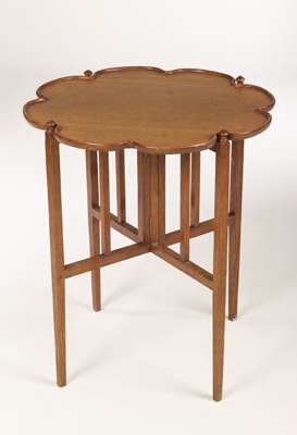 the tray of moulded and lobed form, resting on folding supports with turned finials linked by stretchers