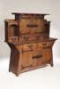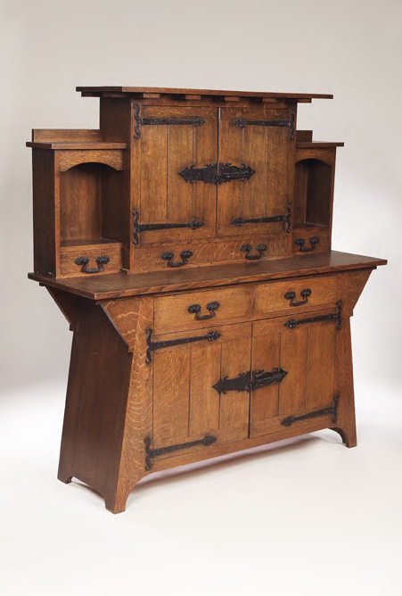 the superstructure with overhanging cornice and an arrangement of twin doors with two drawers below flanked by open shelves, the base with two drawers over two doors raised on bracket feet, decorative iron handles and hinges
