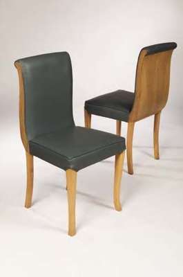 comprising a dining table, the quarter veneered rectangular top with glass preserve above twin pedestals with lobed ends and stepped plinth, 91cm wide, 74cm high, 205cm high and a set of six chairs, each with leather upholstered scrolling backs and seats on square cabriole legs (7)