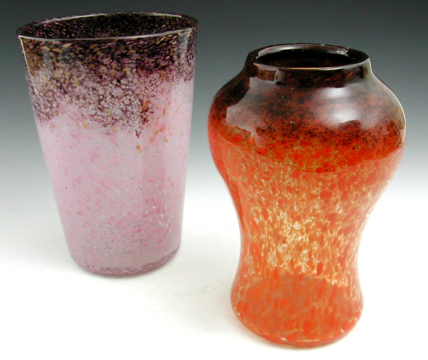 with a pink body with a aventurine and amethyst inclusions to the rim, 23.5cm high; and a Monart baluster glass vase, the orange body with amethyst inclusions to the rim, 22cm high (2)