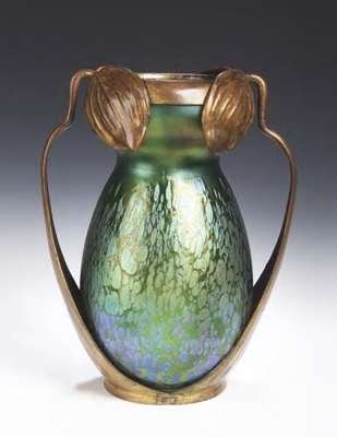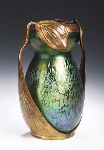 designed circa 1903 for E. Bakalowits, the gourd-shaped body with peacock iridescence held by cast leafy mounts