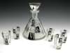 comprising a facetted decanter of broad tapering form with heavy stopper, etched with foliate panels and enamelled in black, 23cm high and five matching glasses (6)
