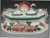of shaped rectangular form, surmounted by opposed fish centred with a shell above two covers enclosing glass wells, the body decorated with Dog Roses, impressed factory marks