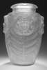 of shouldered tapering form, moulded in relief with fern fronds and to the shoulders with four masks, the slightly domed lid similarly decorated, etched marks 'Lalique, France'