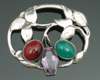 of oval outline, worked as a leafy branches set with green and ruby cabochon stones and with facetted amethyst-coloured stone, stamped marks