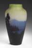 of shouldered tapering form, the grey and lemon glass body overlaid in blue and amethyst glass and acid etched with trees in a mountain landscape, cameo mark 'Galle'
