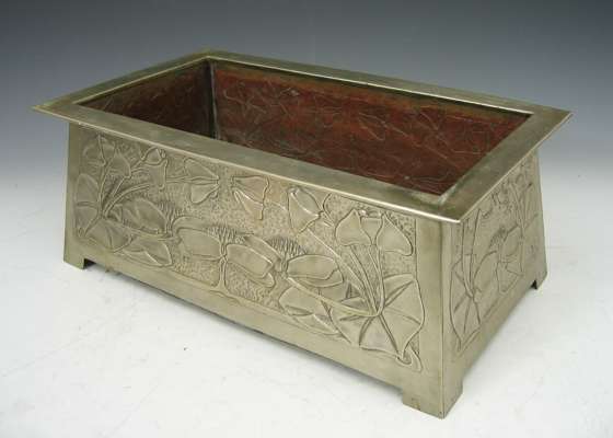 of rectangular outline with broad rim, repousse decorated to the sides with flowering waterlilies