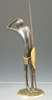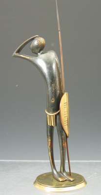 cast as stylised African warrior in standing pose, holding a spear and shield and raised on an oval base, stamped marks