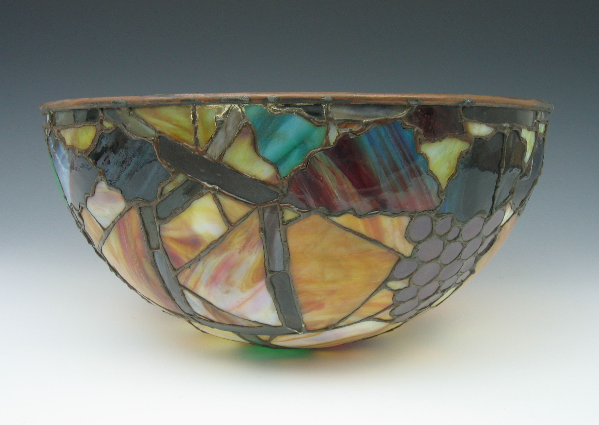 of semi-hemispherical form, decorated in coloured glass with fruiting vines