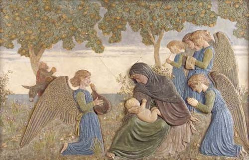 depicting the Virgin and Child with attendant angels in a landscape, polychrome decoration, framed (repairs)