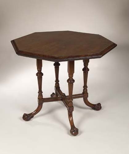 the design attributed to E. W. Godwin for William Watt, the octagonal top with moulded edge, above square and tapering reeded supports, with beaded knops, linked by panelled stretchers on outswept legs, terminating in carved claw and ball feet with pot castors