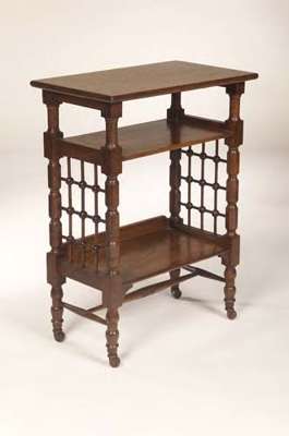 with chequer banding, the rectangular top above two lower galleried tiers linked by turned and blocked supports, the sides with latticed grilles, the whole raised on turned legs linked by stretchers