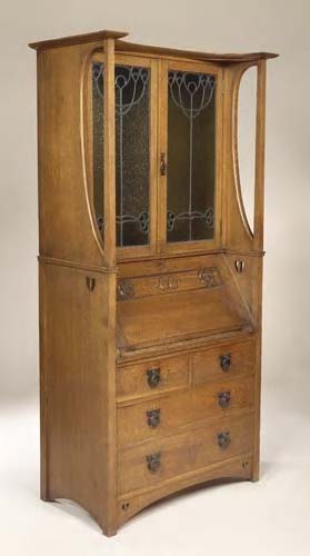 attributed to E.A. Taylor for Wylie & Lochhead, Glasgow, the curved cornice with square supports, enclosing two glazed and leaded doors above a sloping fall, carved in bas relief with rosettes and leaves enclosing an interior with drawers and pigeonholes, above two short over two long drawers and with pierced bracket feet