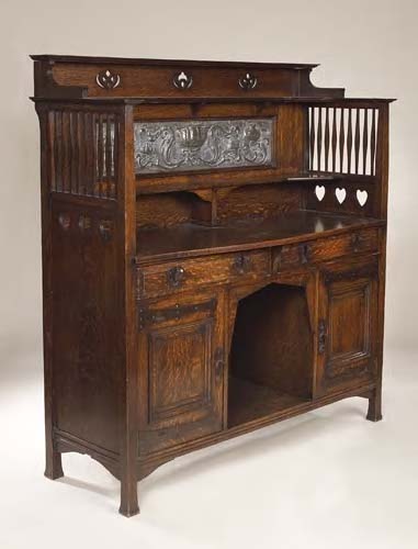 the superstructure with pierced gallery above embossed frieze and open shelf, enclosed by slatted sides, the shaped top above three drawers and an open shelf flanked by panel doors, the whole raised on square legs