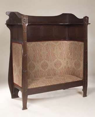 designed for J.S. Henry, circa 1900, the shaped back and sides with open shelf above an upholstered panel, the shaped uprights carved in relief with stylised plant forms, the whole raised on bracket feet
